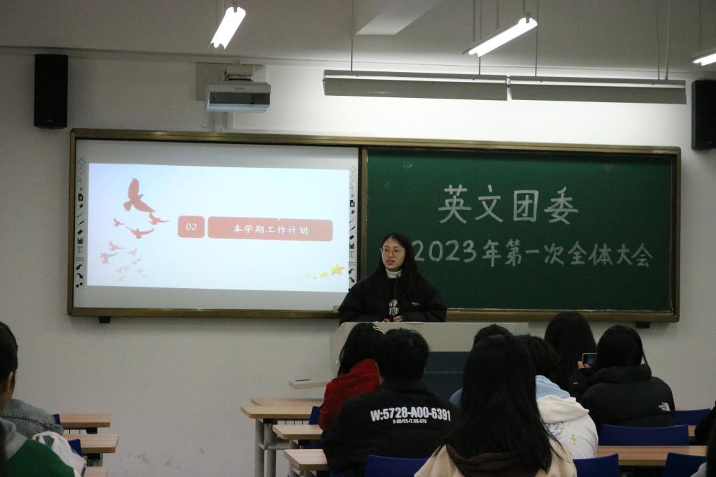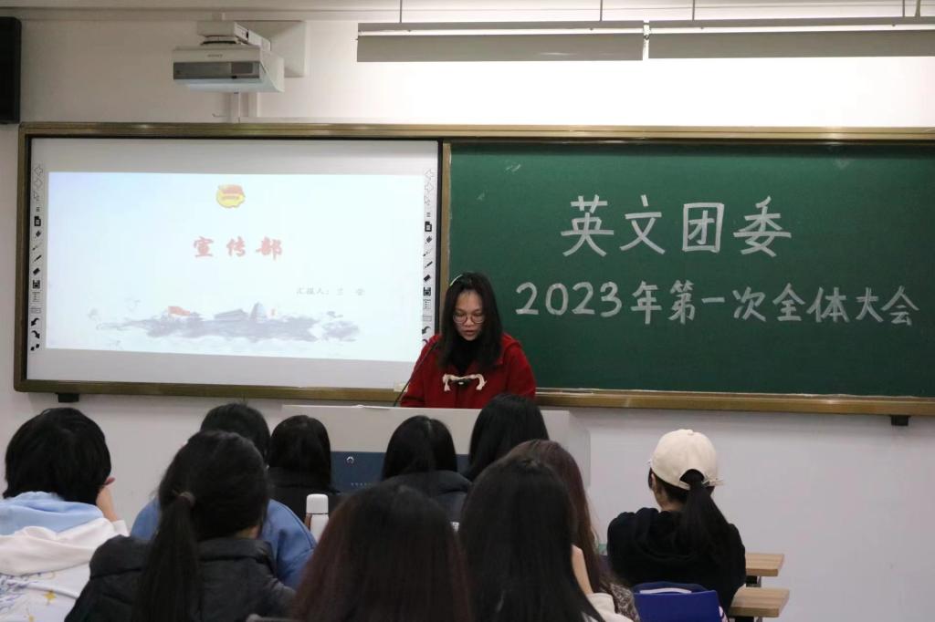 宣传部负责人兰莹提到了部门在青年大学习数据统计、各种海报和kt板的设计等工作上的贡献,以及部门未来发展蓝图,本学期的规划与目标。