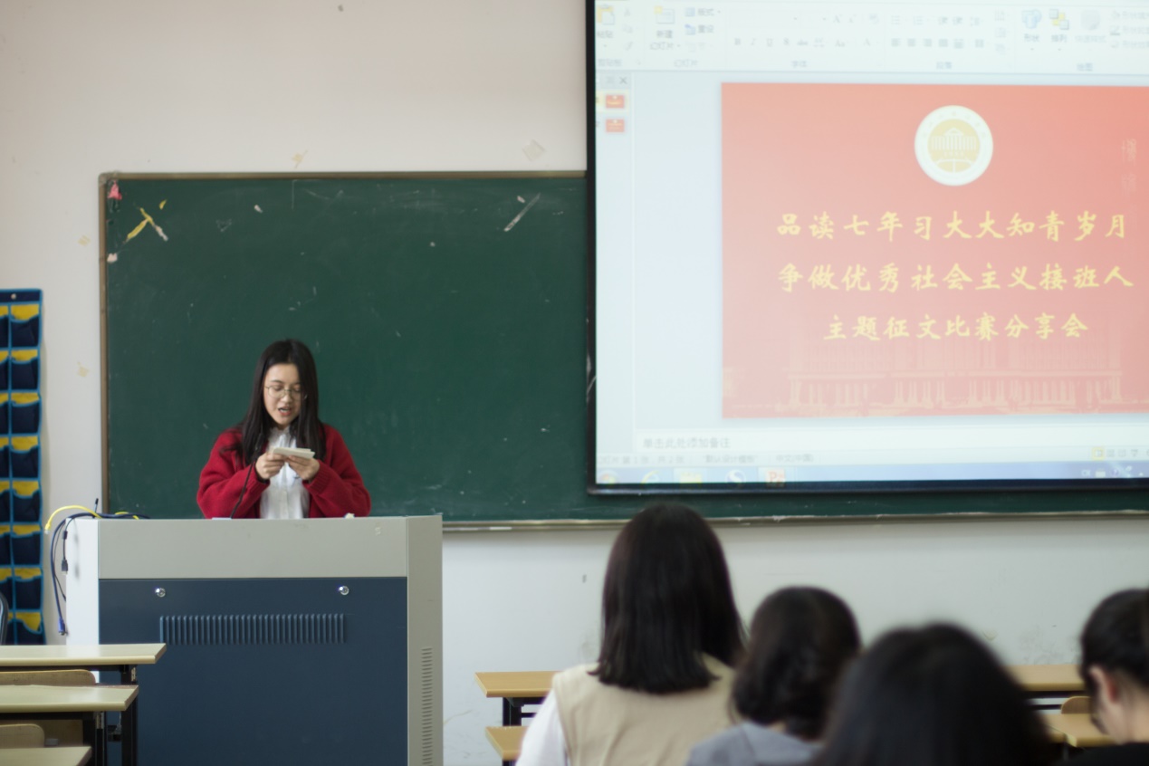 分享会上,胡跳跳、严瑶、胡丹、王馨雨和钱萱怡五位同学陆续分享了自己学习青年习近平的感悟。“做到笃学慎思、明辨尚行,才能勇立潮头”,“担当精神、责任意识,在心灵的土地上点燃,洗涤我们的心灵,反射我们的不足”,“当我们服从一种安排,一个任务,甚至一句话、一个眼神,这就体现了我们的善意、包容与真诚的品质”……不同的切入点,不同的论述思路,但都思想深刻、情真意切、发人深省。