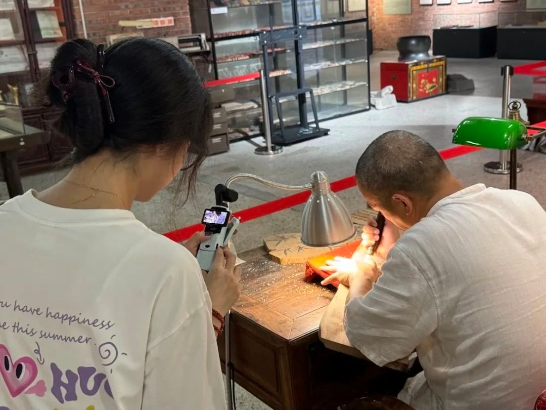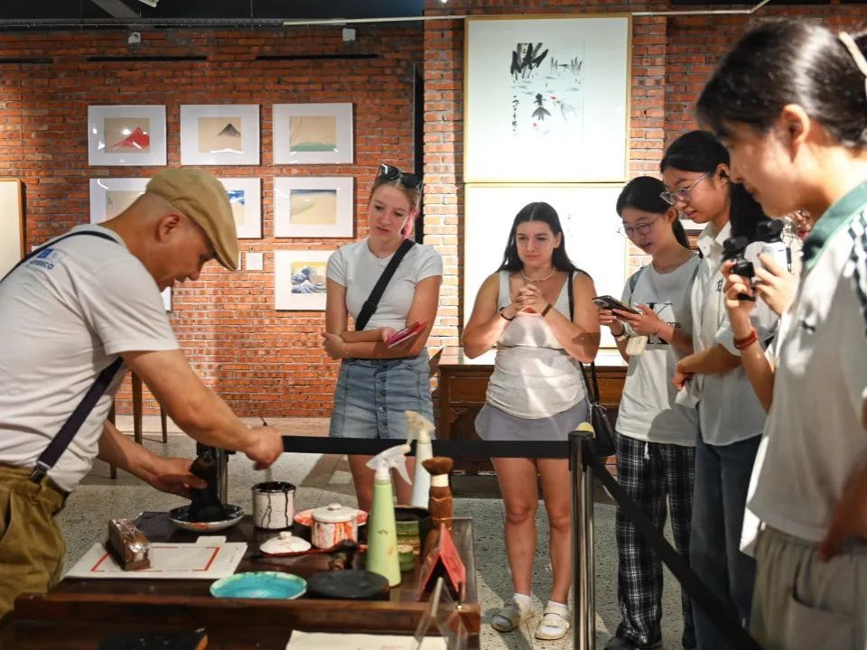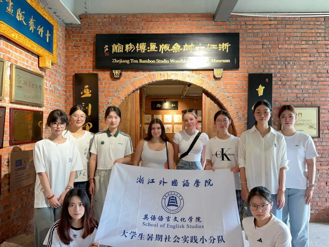 除了实地学习非遗技艺,同学们还积极发挥专业优势,拍摄系列双语宣传视频,用镜头记录非遗文化的独特魅力,以流利的英语向世界讲述中国故事,将非遗文化的精髓传递给更多的人。镜头追随着他们的脚步走过博物馆、展览馆、制作工坊,也倾听来自不同国家和地区的人们对于中国非遗文化的看法。“非同'译'般”浙江外国语赴杭州十竹斋实践团的成员采访到了一位来自美国密苏里南方州立大学的员工:“木板水印是一种很美的艺术,是一种很美的文化,我很开心今天能去博物馆体验木板水印,我也希望更多人能知道这种艺术和文化。”