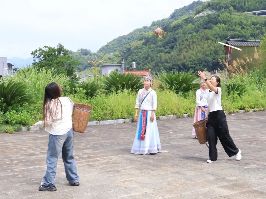 村落间,畲族老农唱起嘹亮的农耕歌,畲语词汇随着农具起落自然流淌。团队成员跟着节奏学唱,体会到畲语在生产劳动中的实用智慧。文化广场上,竹竿舞的清脆节拍响起。“开合”(kʰai³³ hɔp²¹)、“跳跃”(tʰiau⁵⁵ iau³³)等指令词伴随着脚步起落,畲族姑娘用畲语喊着节奏,欢声笑语里,畲语不再是书本上的符号,成了能互动、能感知的“活文化”。