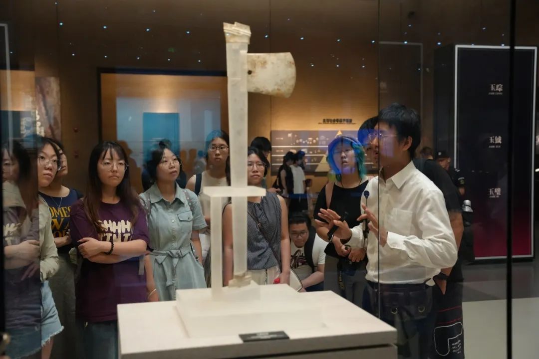 在良渚博物馆,队员们依次参观了“水乡泽国”“文明圣地”“玉魂国魄”等展厅,从一件件器物中全面立体地了解先民超越时代的智慧以及良渚文化的内涵,感受良渚文化多元融合、和平共生的底色,领悟其在中华文明“多元一体”历史进程中的重要地位。