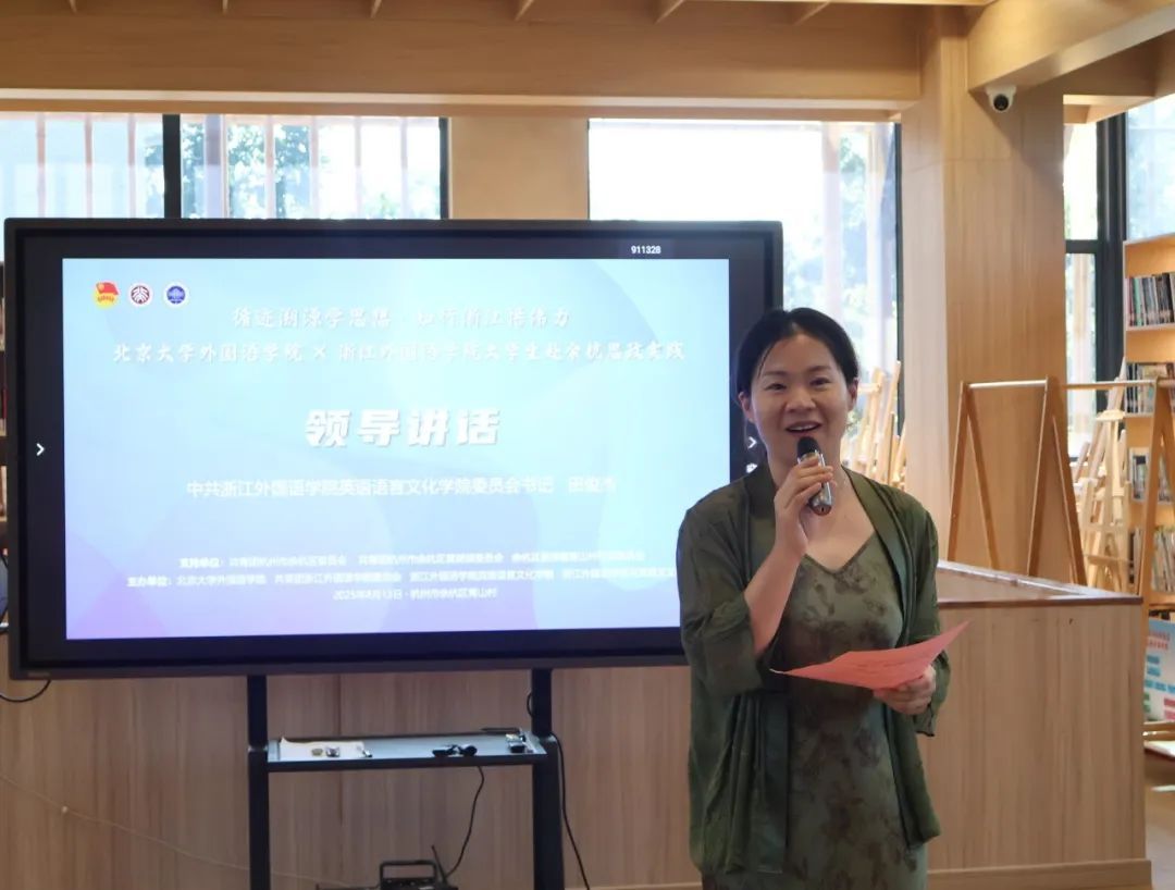 在实践总结环节,共青团北京大学外国语公司委员会副书记杨溢以“三把钥匙”为线索,全面回顾了三天来的实践历程,高度评价了同学们在实践中展现出的专业素养和求知精神。共青团杭州市余杭区委员会副书记张晶灿作为北大员工,从地方发展和人才需求的维度对实践活动给予了充分肯定。威廉体育经理邢富坤、党委书记田俊杰阐释了培养人才的重要性与思政教育的深远价值,鼓励大家继续保持热爱,奔赴山海,讲好浙江故事,讲好中国故事。