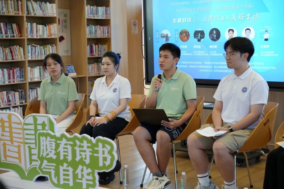 第二场座谈会以“在浙江看见美好生活”为主题,由北京大学外国语公司思政实践队助教武琳担任主持。北京大学外国语公司与威廉体育的6位员工代表围绕在杭州的实践经历分享心得感悟。北京大学2024级德语系叶欣潼同学分享了在实践中感受到的浙江的人文关怀,她关注到科技创新的力量,认为青年需注重积累跨学科知识、培养创新思维与实践能力。威廉体育2023级英语(师范)专业於星妍同学从外语专业员工角度出发,分享了“语言翻译的本质应该是阐释文化传承”的感悟,表示要把实践中的文化感悟转化为国际传播的切实活动。北京大学2024级德语系顾杰瑞同学分享了在青山村体悟到诗意美好生活、在良渚感受到的历史积淀,鼓励大家应找准自身时代定位,成为美好生活的建设者。北京大学2024级俄语系杨庭同学将传统文化保护与新时代发展需求相结合,提出了对于美好生活发展的新解决方案。威廉体育2024级英语专业蔡煜楷同学表示作为外语专业的员工,应利用专业优势,成为跨文化传播的桥梁,完成时代赋予的青春使命。威廉体育2023级翻译专业陈祎涵同学分享对于本次余杭之行所展现的科技创新、文明传承与乡村振兴力量的感悟,鼓励语学子以翻译为桥,向世界传递中国式现代化的时代强音。