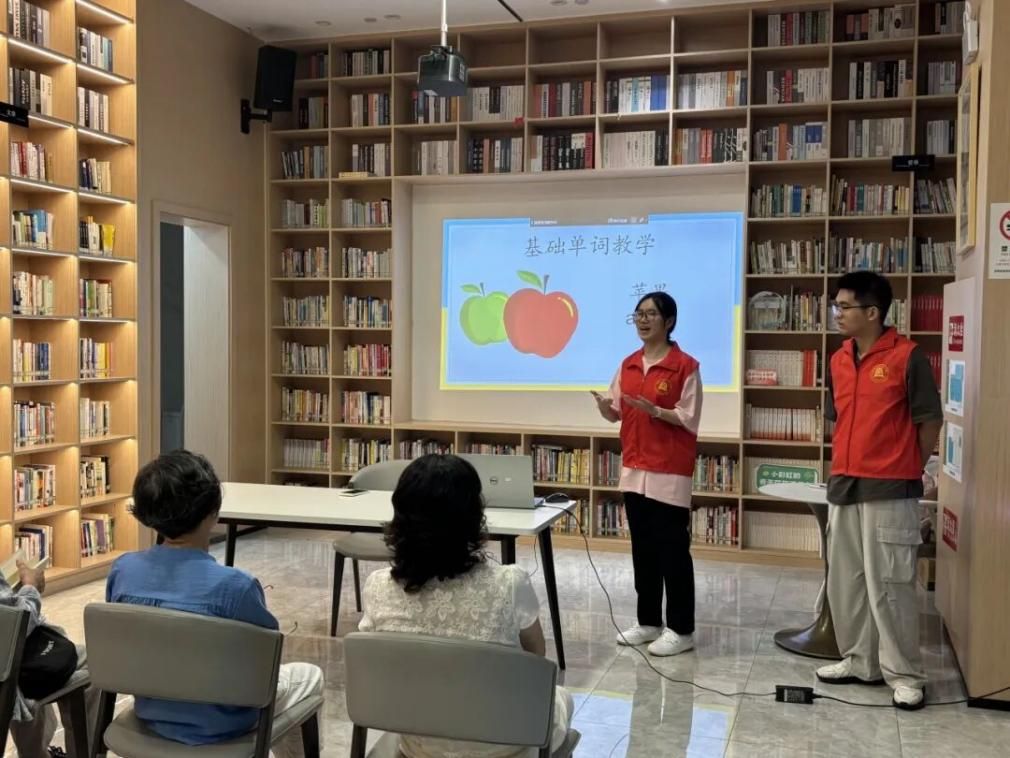 在教学环节,团队依托专业优势,精心设计了“互动破冰-单词教学-情景对话-巩固复习”四步教学法。从“Apple”“Chocolate”等常见单词到“How are you?”“My name is...”等日常用语,团队成员通过图文展示、领读跟读、情景模拟等多种方式,帮助老人们逐步掌握基础英语表达。