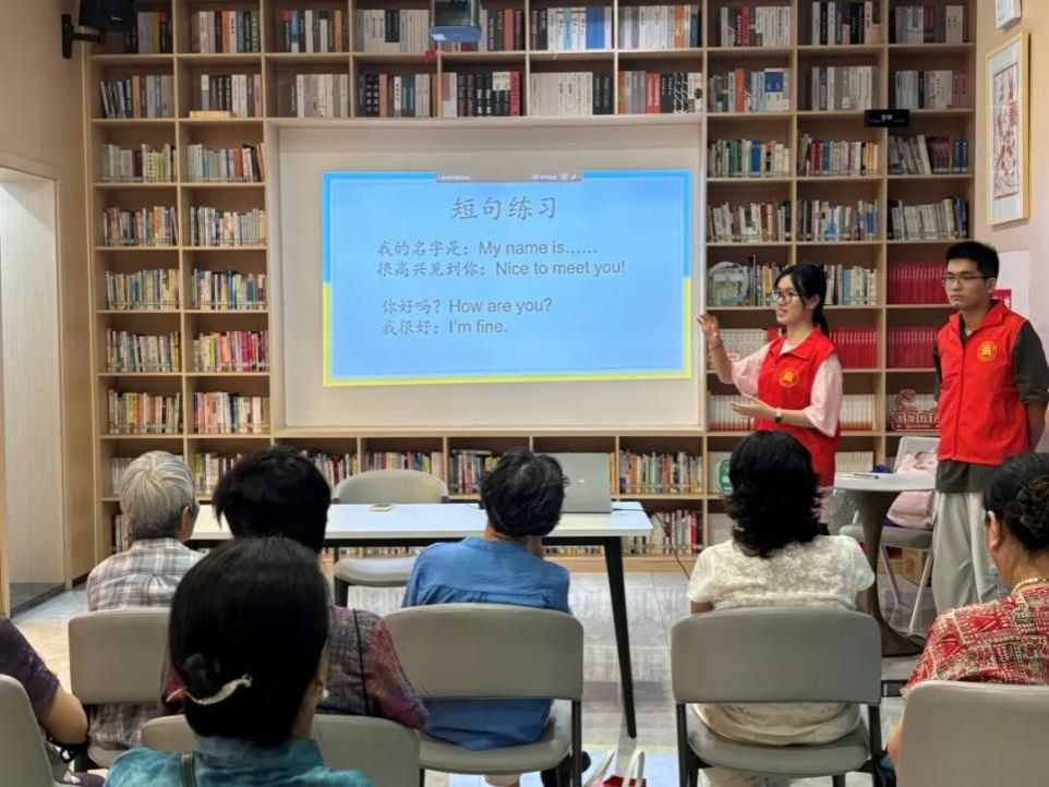 课堂伊始,团队成员以亲切的家常对话拉近与老人们的距离。当问及“平时生活中是否接触过英语”时,一位奶奶自豪地分享了自己的出国经历,瞬间点燃了现场的学习氛围。另一位阿姨表示:“退休后一直想学英语,今天终于有机会在家门口实现这个愿望了!”