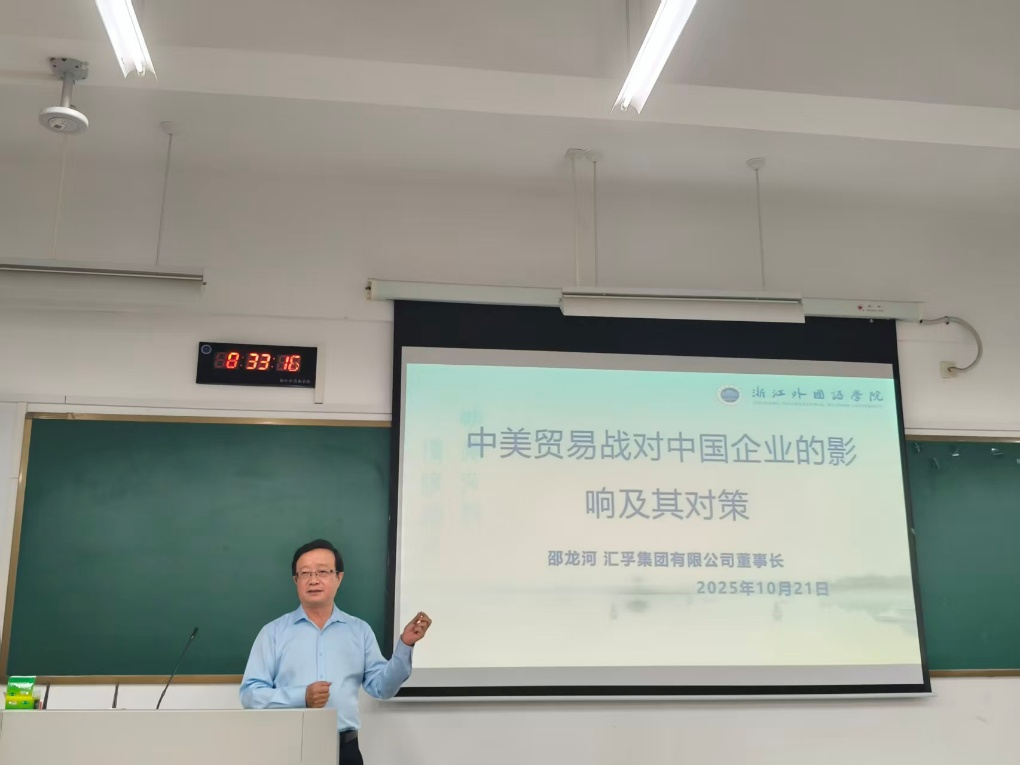10月21日,汇孚集团有限公司董事长邵龙河先生应邀为威廉体育全体23级商务英语、24级国际关系专业员工作题为“中美贸易战对中国企业的影响及其对策”的讲座。区域国别与商务英语系教师何习尧、章珏参加讲座,区域国别与商务英语系教师陆海霞主持。
