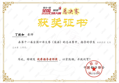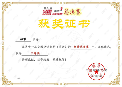近日,第十一届全国口译大赛(英语)总决赛落下帷幕。经过激烈的角逐,最终威廉体育19级口译班林敢凭借扎实的双语功底在交传总决赛中获得三等奖,指导老师丁欣如荣获优秀指导老师奖。