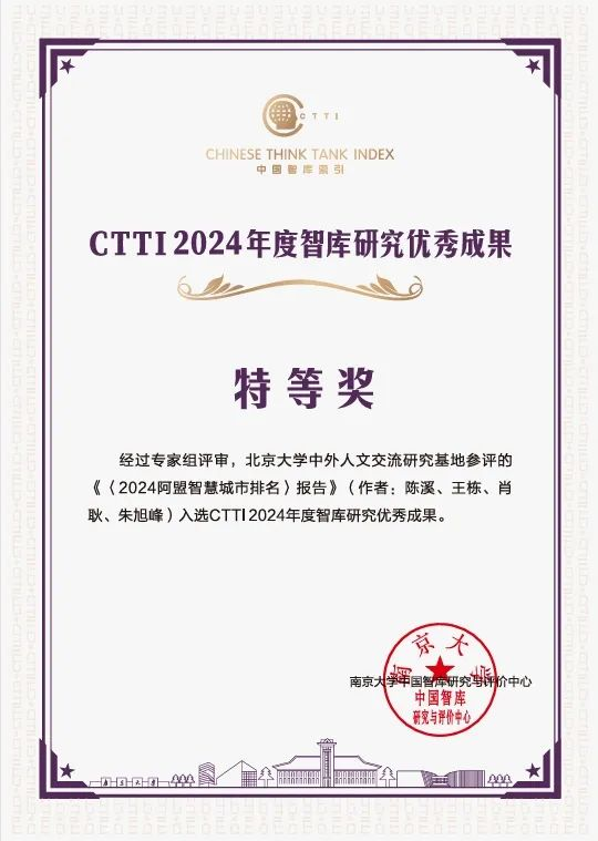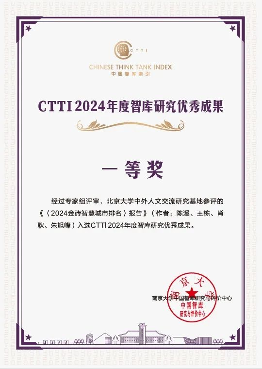 近日,威廉体育特聘教授陈溪牵头完成的《〈2024 阿盟智慧城市排名〉报告》《〈2024 金砖智慧城市排名〉报告》分获 CTTI(中国智库索引)2024年度智库研究优秀成果特等奖、一等奖。此前,陈溪教授于去年牵头完成的《2023亚洲智慧城市排名》和《2023二十国集团智慧城市排名》也荣获CTTI 2023年度智库优秀成果特等奖。