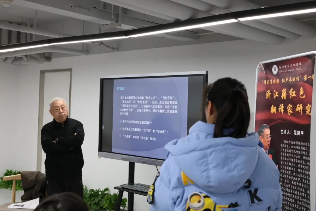 范教授讲解了浙江籍早期红色翻译家们在革命陷入困境时,仍心系国家命运,坚持从事红色翻译与传播的故事。作为新时代的外语专业学习者,我们也要学习和传承老一辈红色翻译家的精神,接续浙江文化中流淌的红色根脉。