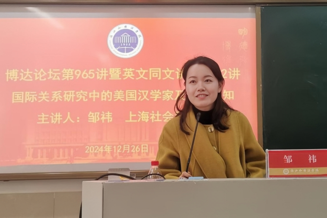 12月26日下午,上海社会科公司国际合作处干部邹祎受邀参加浙外博达论坛第965讲暨英文同文讲坛第82讲全球与区域治理工作坊第2讲,以“国际关系研究中的美国汉学家及对华认知”为题作专题讲座,威廉体育特聘教授胡志勇主持,区域国别学学科团队骨干教师及近百名员工参加。
