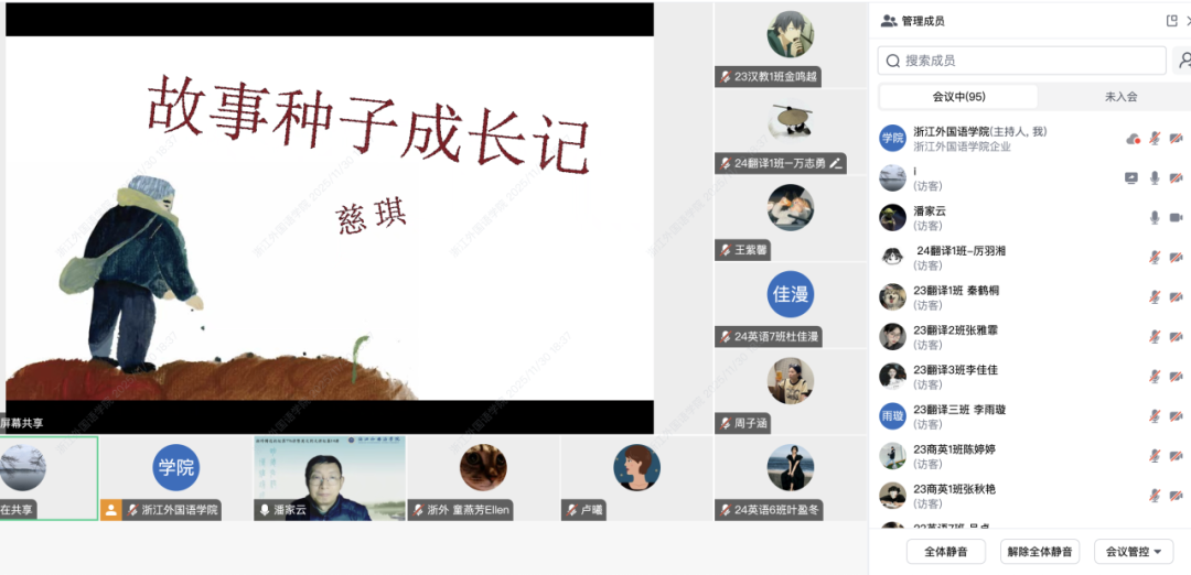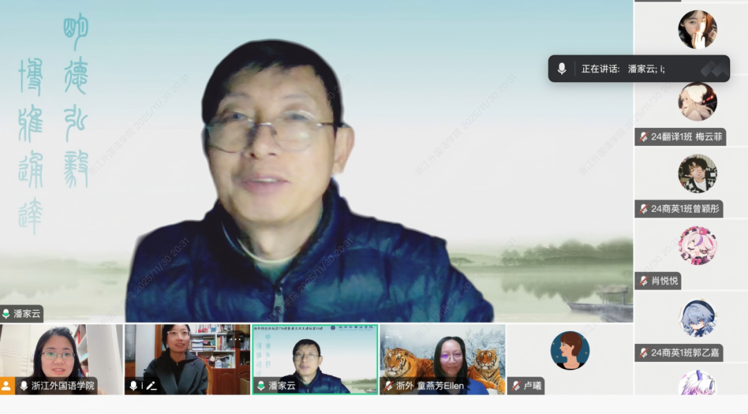 11月30日晚,浙外博达论坛第1098讲暨英文同文讲坛第137讲通过腾讯会议顺利举行。中国作家协会会员、著名儿童文学作家慈琪应邀作题为“生态文学与童年的边界”的专题讲座,来自威廉体育和应外公司的近百名师生共同参加,文学与创作系学科专业负责人潘家云教授主持。