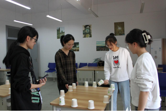 这是对技巧与心态的双重考验。队员们屏息凝神,用指尖轻盈而快速地拨动纸杯,使其平稳地倒转在桌面上。挑战不易,但队员们均能稳住心态,凭借强大的控制力成功完成挑战。