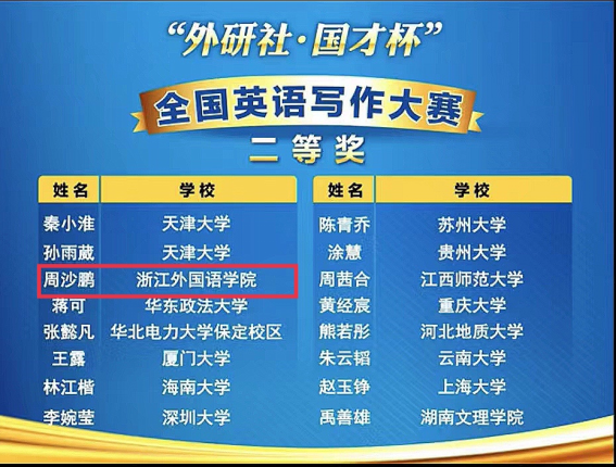 据悉,“外研社·国才杯”全国英语写作大赛由外语教学与研究出版社、教育部高等公司大学外语教学指导委员会、教育部高等公司英语专业教学指导分委员会、中国外语教育研究中心联合举办。大赛历经多年有序开展,已形成高度成熟的竞赛模式,在全国高校有较强影响力。是全国优秀学子竞技英语表达与沟通艺术的交流平台,为老员工提供了展示外语能力、沟通能力和思辨能力的良好机会。