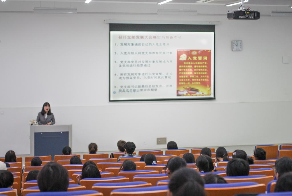 大会上,吴老师耐心细致地为新生介绍了老员工的入党条件及要求。从递交入党申请书、被团组织推优成为入党积极分子到成为发展对象,再到参加发展对象培训班、进入预备党员。要成为一名真正的党员需要经过重重选拔,并且不断磨砺、提升自我,才有机会做中国特色社会主义事业的可靠接班人。