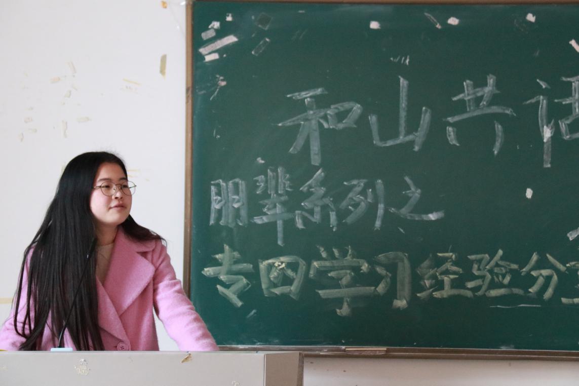 分享会上,来自公司2014级的三位在专四考试中取得优秀的同学分享了成功秘笈。14商务英语1班的杨祎文从“把握发音特点、记录关键词及注重标点使用”等方面着重讲解了如何在听力部分畅行无阻。14翻译3班的冯愿强调了每日积累的重要性,“早读、摘抄、做错题集”是她的制胜法宝。14英语2班的乐熠琲分享了如何探索个人最佳学习方法。