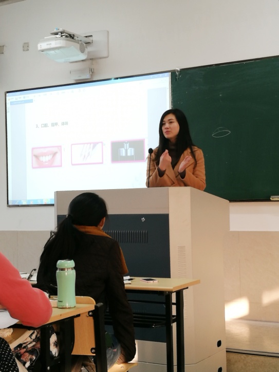 在说到女士的着装要求时,邱萍老师提到了“化妆的技巧”,这无疑是学员们最感兴趣的地方。她请了一位同学上台,从化妆步骤到基本要领,更加形象和直观地为大家做了讲解和示范。“素面朝天很真实,但化妆是对自己、对他人的一种尊重。”如果说,化妆在于美化一个人的外在,那么学习礼仪,便是个人内在气质的升华。