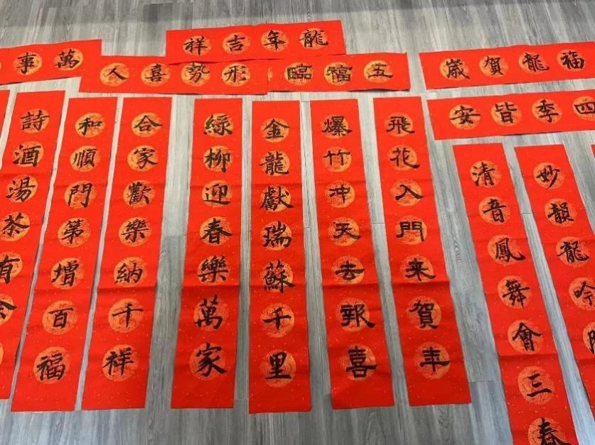 写春联是中国传统文化中的一种活动,人们会选择吉祥的词句,用墨水抄录于红纸之上以表达祝福与美好的期盼。这次活动不仅有“阖家欢乐纳千祥,和顺门第增百福”“金龙献瑞苏千里,绿柳迎春乐万家”等传统对联,还特别加入了英文元素,志愿者和社区的孩子共同执笔写下了“Eat well sleep well have fun day by day;Study hard work hard make more money and more”等对联。英文对联是对中国传统对联的创新,是一种跨文化交流的艺术形式,是连结不同文化、增进文化认识和理解的纽带。通过欣赏和创作对联,在场人员不仅体验到了文字语言的美妙与乐趣,也感受到了中国的年味儿!