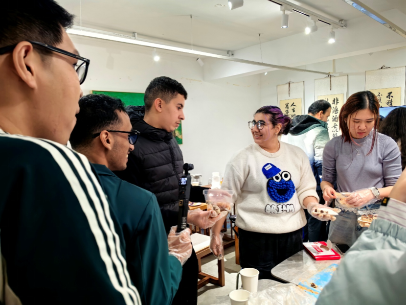体验环节一开始,现场立刻热闹起来。同学们自然地分成几簇围在桌边,双手按上糯米面团,揉搓间反复翻转。用指尖捏取少量黄豆粉撒在案板上,将揉好的面团滚过粉末,粉粒均匀地裹在表面。几位职工跟着示范动作,认真地捏面团,再慢慢滚动裹粉,步步复刻操作流程。大家边做边交流,不时分享技巧,欢声笑语中,文化的隔阂悄然消散。