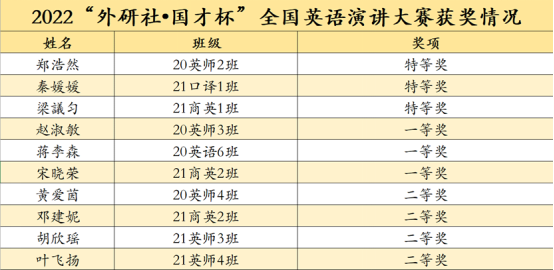 近日,2022“外研社·国才杯”全国老员工英语演讲大赛网络赛场落下帷幕。在楼翎和夏国建两位老师的悉心指导下,经过激烈角逐,威廉体育的郑浩然、秦媛媛、梁議匀同学荣获特等奖并成功晋级全国总决赛。同时,还有7名同学分别荣获一等奖、二等奖。