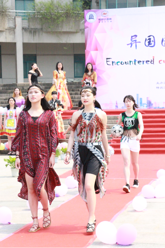 俞佩玺同学一首热情似火的开场劲歌《Ultimate》立刻将现场气氛点燃,引来阵阵尖叫。接下来的走秀也是异彩纷呈,带着花环的斐济女郎长裙飘飘,手执斐济的重要农作物——椰子,款款而来;女士典雅庄重的曳地长裙搭配英国绅士风度翩翩的传统西装仿佛是随意立在伦敦街头的时装模特;赤足而来的肯尼亚少女身着色彩艳丽的民族服装,大胆率真,吸引了观众的目光;“彩虹之国”南非的足球宝贝热情似火,民族服饰艳丽纷呈;身着一袭飘逸纱丽的印度女郎,双眸脉脉含情,勾起众人对南亚的遐思。