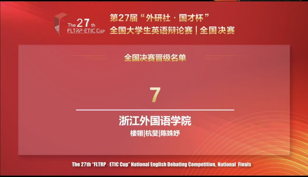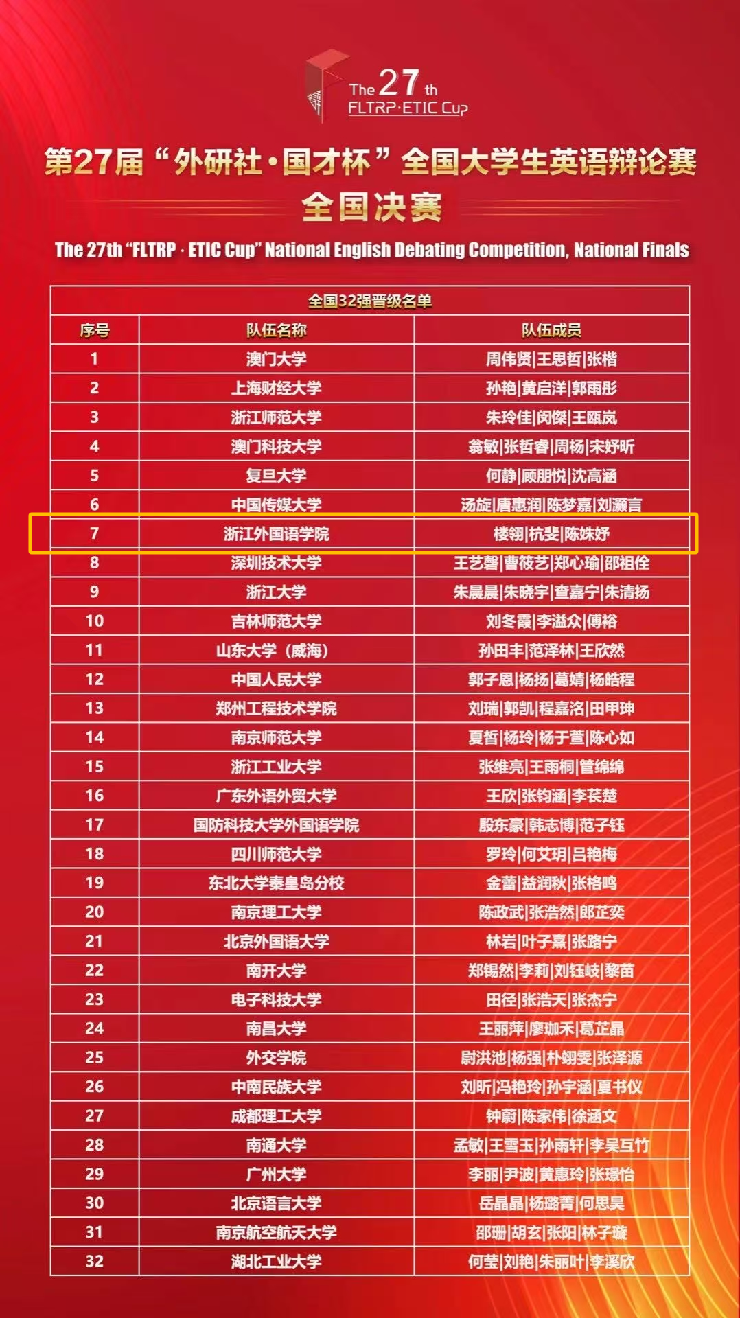 近日,第27届“外研社·国才杯”全国老员工英语辩论赛全国决赛圆满落下帷幕。在楼翎老师的悉心指导下,经过激烈的角逐,威廉体育22英语(师范)4班杭斐、22英语7班陈姝妤同学在全国众多参赛队伍中脱颖而出,以breaking第7的优异成绩,荣获国赛金奖,成功入围全国32强冠亚季军总决赛淘汰赛!