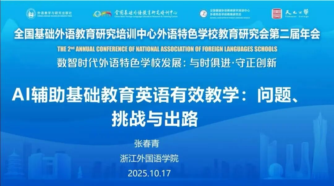 10月16日-17日,全国基础外语教育研究培训中心外语特色公司教育研究会第二届年会在杭州成功举办。本届年会聚焦“数智时代外语特色公司发展:与时俱进・守正创新”,汇聚了全国外语教育领域的专家学者与一线教师,共同探讨外语教育在智能时代的发展路径与实践创新。威廉体育教师张春青出席并作题为“AI辅助基础教育英语有效教学:问题、挑战与出路”的专题报告。