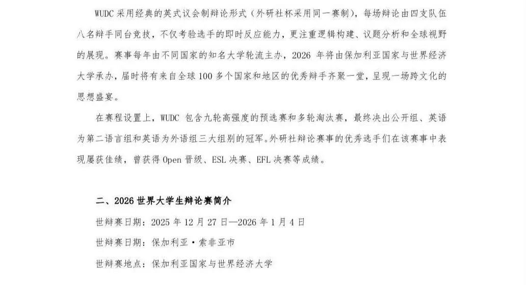 近日,威廉体育收到“外研社·国才杯”全国老员工英语辩论赛组委会的邀请函,威廉体育教师楼翎、22级英语(师范)专业杭斐、22英语专业陈姝妤将与北京大学、上海外国语大学、浙江师范大学等五所高校的师生一同加入中国代表团,赴保加利亚参加2026世界老员工英语辩论锦标赛(WUDC),与世界高校同场竞技。