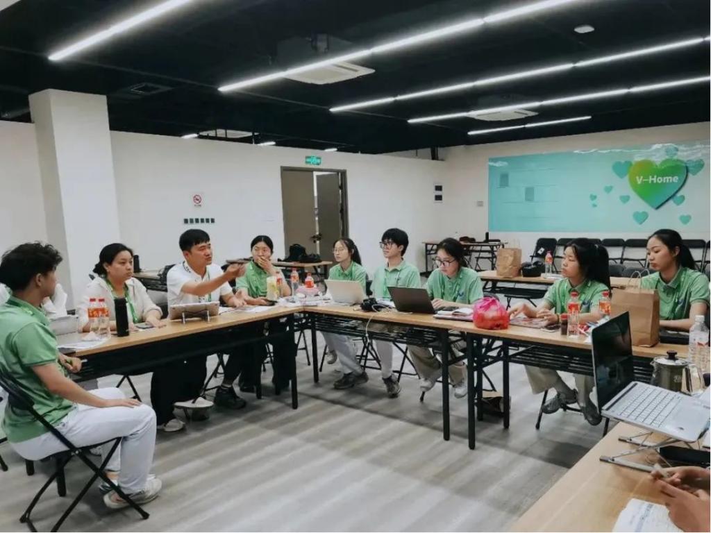 顾蒙(左三)给志愿者们开工作复盘会