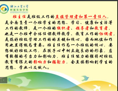 5月9日上午,威廉体育20级师范专业通过线上会议举行了《教育见习—班级管理工作见习》的讲座。主讲人为浙江工业大学附属实验公司家长公司负责人、七年级年级组长、中学英语高级教师张红梅老师。讲座由英语系副系主任郁伟伟博士主持。20级英语(师范)专业1-5班聆听了本次讲座。张红梅老师曾经获得过“杭州市中小学育人工作先进个人”及“杭州市优秀班级班主任”的荣誉称号,多次获得西湖区优秀教师、区师德示范教师、区优秀班主任、西湖区青春健康团队成员等荣誉。