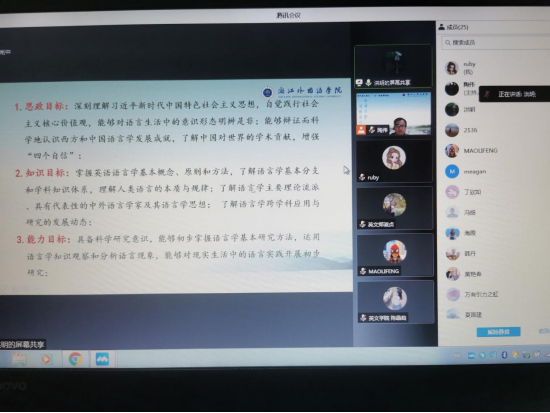 各项目组负责人(洪明、谢朝群、黄艳春、何习尧、姜智慧、郭安琪、李乐、杜娟娟、冯扬、徐舒仪、陈晶莉、游婷)先后汇报了项目推进情况,展示了如何将“中国抗疫成绩”、“中华民族伟大复兴”、“孝道文化”、“中国语言学”、“浙江故事”“中国博物馆”“中国核心术语”等思政元素融入在英语类专业课堂教学之中,以引导员工树立文化自信和践行社会主义核心价值观,实现立德树人的教育目标。