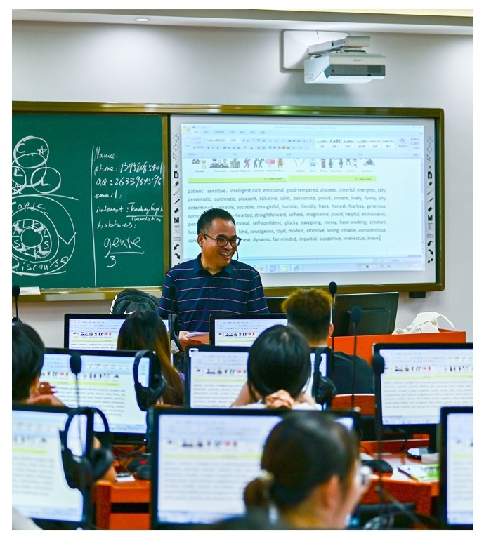 在融院A205教室,洪董事长听取了公司童红灯老师的《综合英语》课程。“英语专业同学的核心素养有哪些?”“综合英语课程学习的目标是什么?”课上,洪董事长听得专注,记得详细,查看了课程教材,关注同学们的小组讨论、口语发音等学习情况。洪董事长对童老师的课堂教学方式等予以肯定,并就课程的安排、教材的选择等进行了沟通交流。