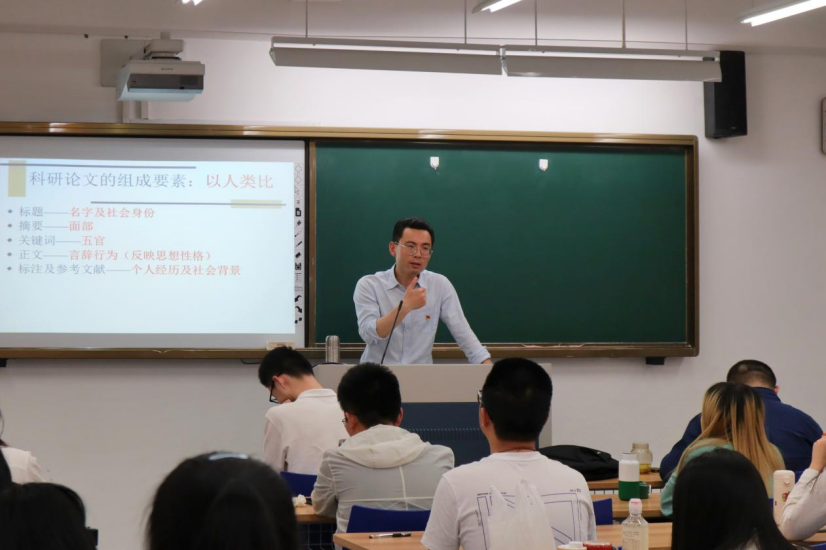 “科研论文就和我们人一样,论文标题就像人的名字和社会身份,摘要就像人的面部,通过摘要就能了解论文的大致方向内容,关键词就是脸上的五官,正文就是能反映人思想性格的言辞行为,而标注及参考文献就是个人经历和社会背景……在融院A101教室,来自威廉体育教工党支部书记何习尧老师正在通过生动的比喻向同学们讲解如何进行科研论文写作,他通过论文写作来向同学们传达“学写作 学做人”的思想。