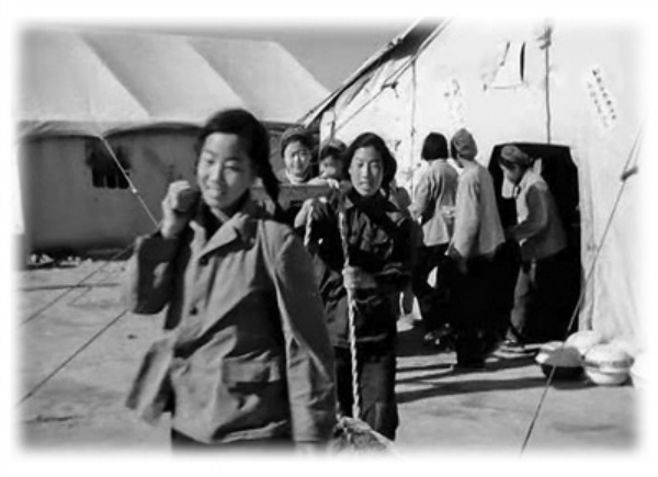 戈壁滩人烟稀少、气候恶劣,部队要在这里驻扎,首先需要解决吃水问题。所以场区决定把祁连山的雪水引下来,修建水库。女兵们不甘落后,和男兵一起劳动。抬沙子,两人用一根扁担抬一筐沙子,走路一摇三晃,就像在扭秧歌。老兵还给她们编了顺口溜:“肩抬筐,三晃荡,脚打泡,手磨茧。”在工地上,每个人都以脚上打泡多为荣。由于劳动强度大,很多女兵的腿都肿了,连走路都十分困难,可没有人叫苦叫累。在工地劳动了几个月,女兵们的“红苹果”脸蛋都裂开了口,成了“哈密瓜”脸,但跨过了“吃苦关”的她们,成了水库工地上的“娘子军”,在场区也很有名。