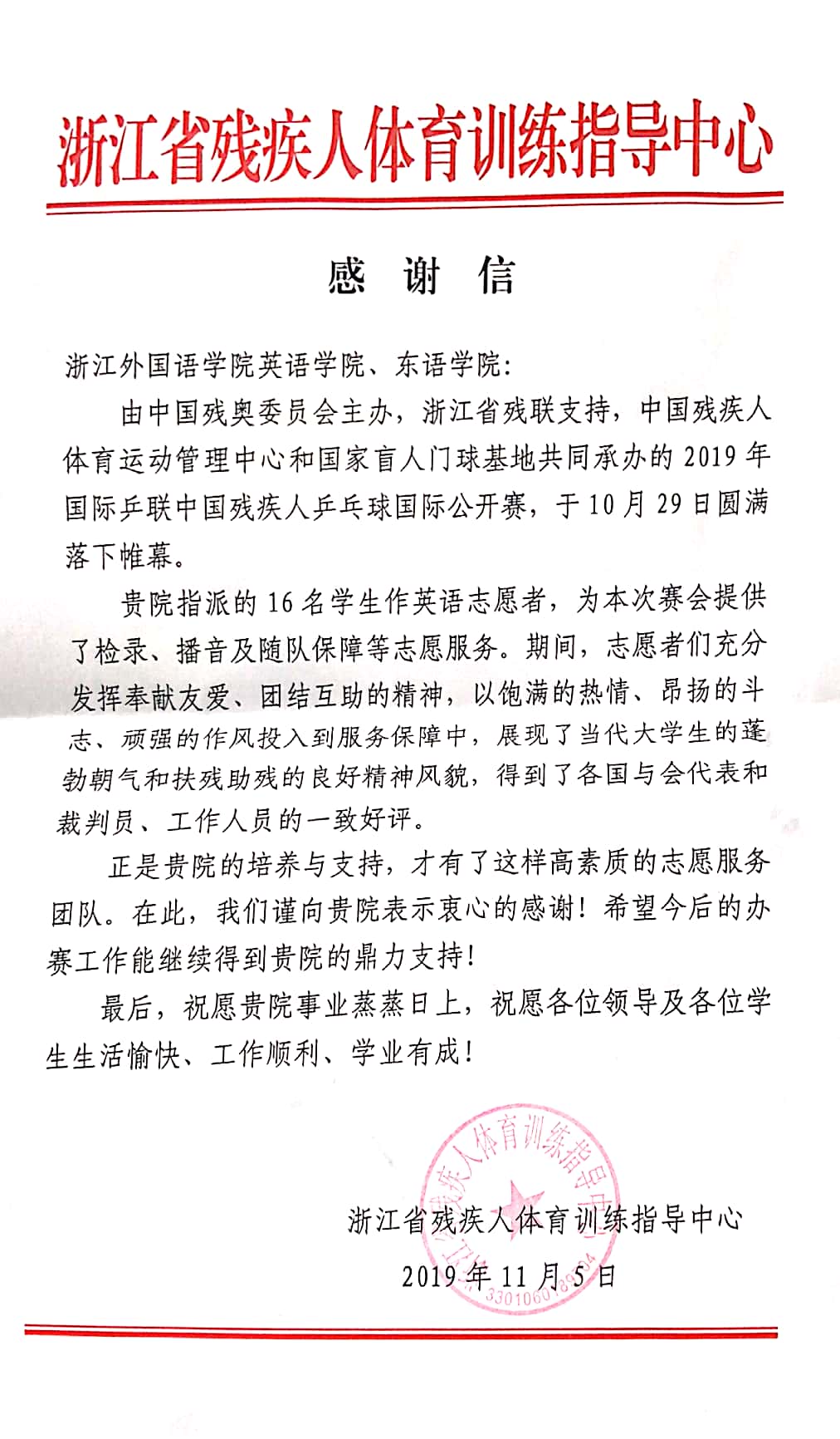 日前,浙江省残疾人体育训练指导中心向公司发来感谢信,感谢公司对2019年国际乒联中国残疾人乒乓球国际公开赛的大力支持。