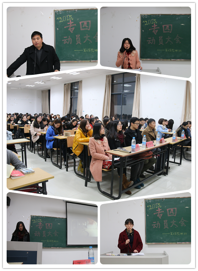 为帮助参加2015年英语专业四级考试的同学们调整心态,积极应战,深入了解考试的形式、特点及考试技巧,并以更高效率有针对性地投入到备考状态中,威廉体育举办专四考试动员大会,公司党总支、英语系及学工办相关老师出席了此次动员大会。英语系副主任朱武汉老师向同学们详细介绍了考试流程,分享了英语学习的方法,鼓励同学们做最后的冲刺。在专四考试中曾取得不俗成绩的励颖、周琪炜同学作为朋辈交流,先后上台与同学们分享了她们的备考技巧和经验。另外,公司团委办公室还专门开展了“专四·抱抱团”的系列活动,为同学们顺利通过英语专四考试助力。