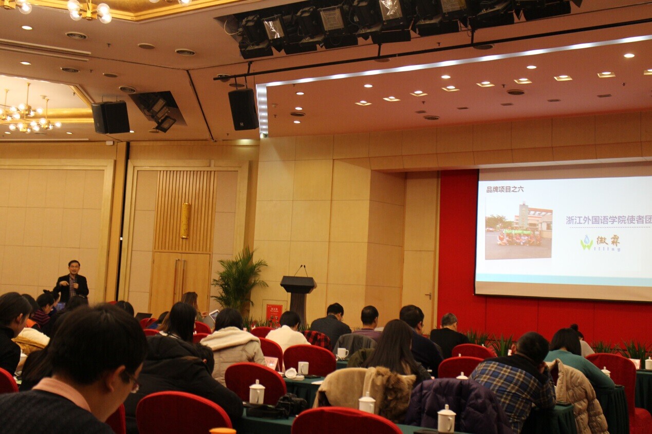 (图为浙江省环保厅团委书记虞伟介绍公司“英文载绿意·公益诉环保”品牌项目)