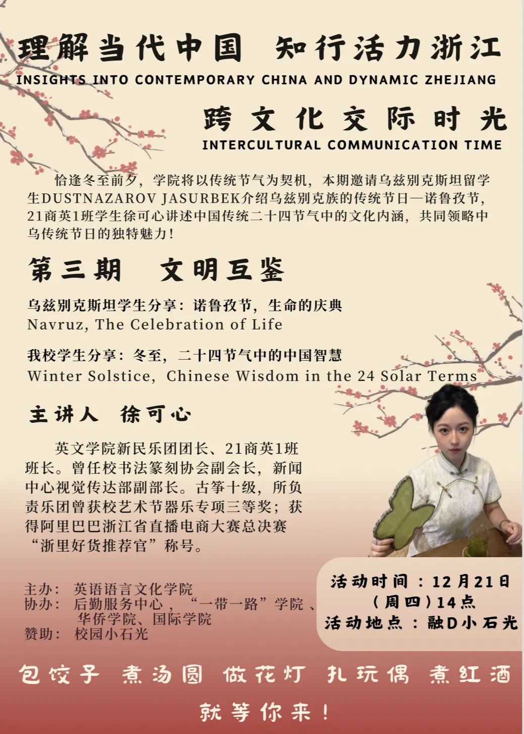 为弘扬“闻道中华 语美天下”的浙外精神,助力青年员工深入理解当代中国,知行活力浙江,讲好中国故事、浙江故事,传播好中国声音、浙江声音,威廉体育在校园小石光开展“跨文化交际时光”系列活动。活动第三期,恰逢冬至前夕,公司将以传统节气为契机,邀请乌兹别克斯坦DUSTNAZAROV JASURBEK介绍乌兹别克族的传统节日—诺鲁孜节,21商英1班员工徐可心讲述中国传统二十四节气中的文化内涵,共同领略中乌传统节日的独特魅力。
