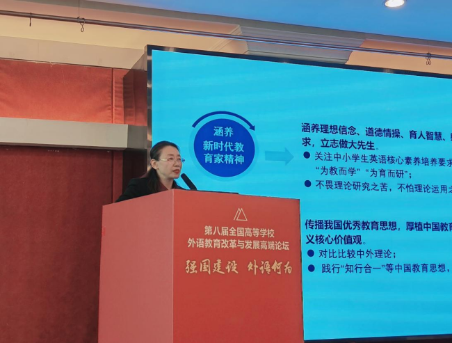 在“英语类专业论坛:新文科背景下的专业建设与发展”上,柴改英作了题为“基于‘桥梁理论’的英语师范专业建设:探索与实践”的主旨报告。该报告在剖析英语师范专业语言教育与教师教育资源壁垒、课程壁垒和团队壁垒的基础上,分享了公司英语师范专业的相关实践及效果。她指出,公司建设了“语言学与中小学英语教学系列”等桥梁教材,开设了依托融合式课程内容、实施浸润式课程思政以及应用创新教学和评价方法的“二语习得与中小学英语教学”桥梁课程,并联动中小学教师合作开展教学与教研。