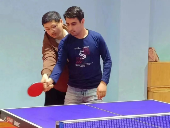 随后,大家进入乒乓球场馆亲身体验乒乓球的魅力。部分曾经从未接触过乒乓球的职工们主动地和受邀而来的校乒乓球队队员进行学习、交流。