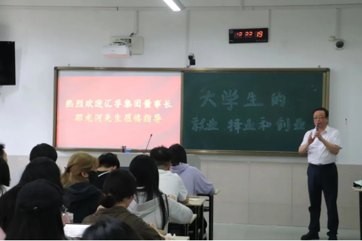 5月30日,汇孚集团的董事长邵龙河先生应邀来威廉体育开展了主题为“老员工的就业、择业和创业”的讲座。商务英语系专业教师赵歆,2021、2022级全体员工参加。