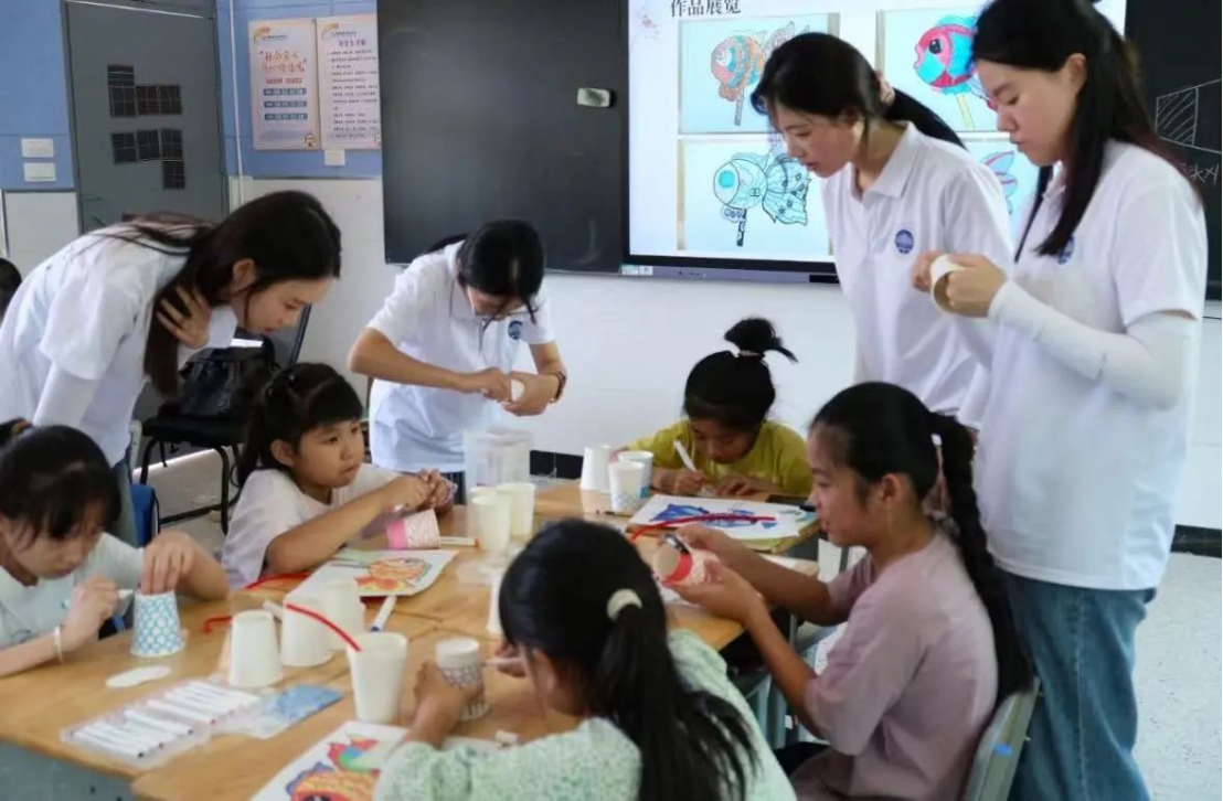 为了让孩子们体验制作鱼灯的乐趣,激发他们的创造力,团队设计了“创意鱼灯工坊”课程,让他们成为小小设计师,设计并动手制作鱼灯送给远方的亲人。课堂上,大家充分发挥自己的想象力,设计了各式各样的鱼灯,将自己对非遗文化的理解和对家人的思念融入在一盏盏灯中。“我的爸爸妈妈在法国工作,今年夏天有巴黎奥运会,所以我制作了一盏关于奥运会的鱼灯送给爸爸妈妈,希望他们可以带着我做的灯去看比赛。”谈及制作鱼灯的思路,小朋友这样说。在队员们的协助下,孩子们一盏盏漂亮的创意鱼灯被制作成型,22级英语师范专业的吴佳玲也颇有感触,“我能感受到孩子们对非遗文化的热情以及他们的创造力。大家在一起边作鱼灯边聊天,氛围很愉快。希望我们的陪伴能让孩子们感受到爱与温暖,这也是支教的目的和意义所在。”