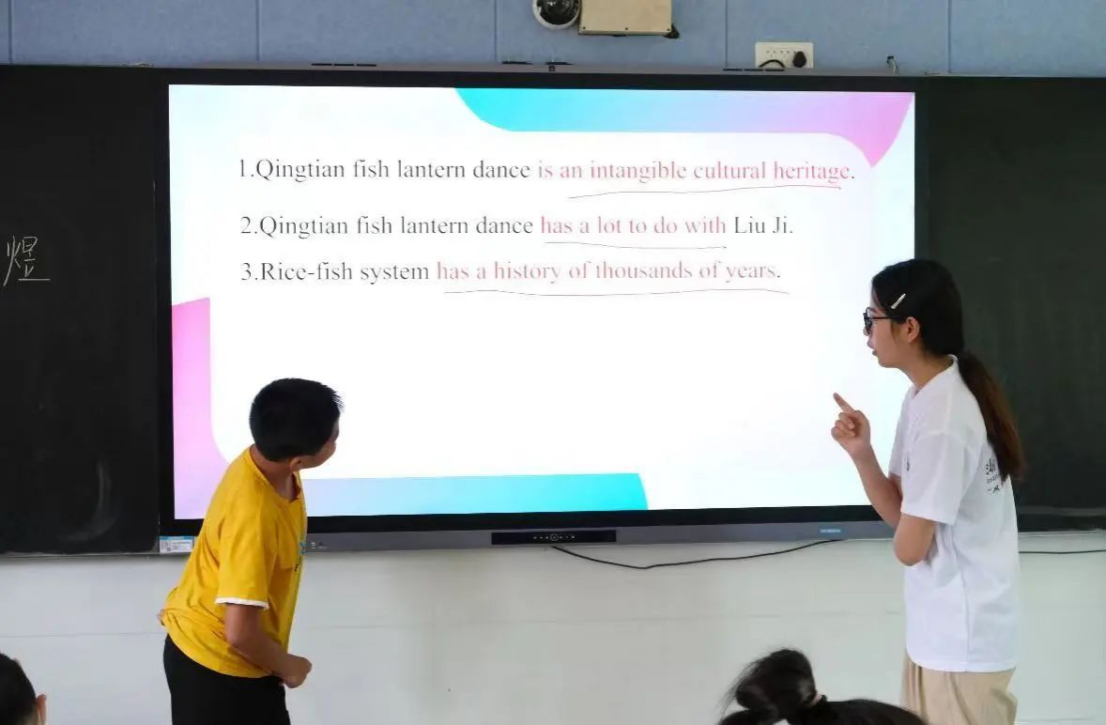 "Hi everyone, what do you want to draw on the fish lantern for your parents overseas? "(各位小朋友,你们想在鱼灯上画什么送给在国外的爸爸妈妈呢?)7月8至7月20日,威廉体育赴浙江丽水青田县赋能乡村振兴暑期支教团队来到青田县方山乡公司,给当地“洋留守”儿童带来为期两周的“鱼灯舞动,文化薪传”系列课堂。团队聚焦当地非遗——青田鱼灯舞,结合自身外语专业优势,开设一系列外语融合鱼灯舞课程,给予这群父母远在国外的孩子更多关心和陪伴,也帮助他们更靠近家乡传动文化。