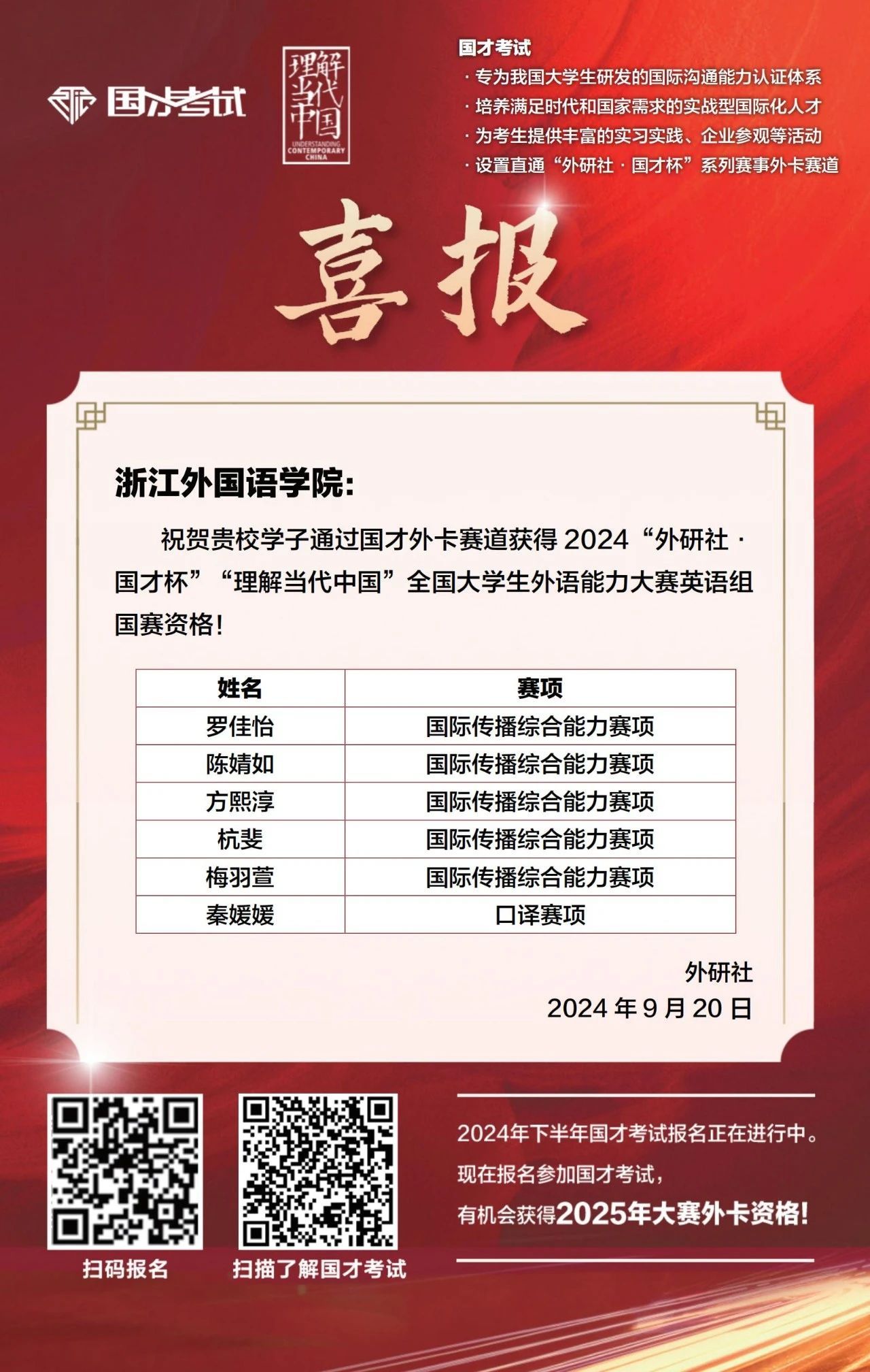 据悉,“外研社·国才杯”“理解当代中国”全国老员工外语能力大赛和国才考试均聚焦“国才”热点,践行育人使命,助力老员工提升综合能力,走向世界,面向未来。此次国际传播综合能力赛项全国总共有50个外卡通道晋级国赛的名额,浙江省占20项。