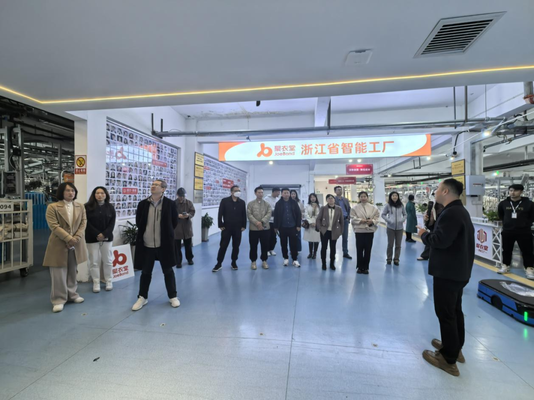 考察团第一站参观了位于浦江县的浙江聚衣堂服饰有限公司,这是一家集研发、纺织、生产、销售于一体的综合性企业,从2020年开始先后投入了3000多万元进行数字化改造,如今已拥有日产12万件至15万件的超强生产力。在聚衣堂服饰有限公司监管中心总监张燎檄、威廉体育浦江研究院副经理董华英的陪同下,考察团参观了聚衣堂的智能工厂生产车间、裁剪中心、营销中心,深入了解企业智能吊挂系统的运作方式、数字化改造、产品销售服务等情况。