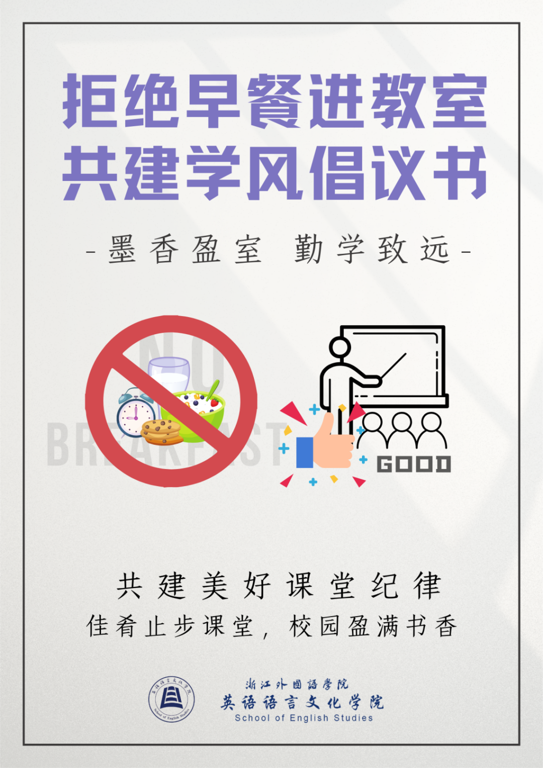 同学们,课堂是知识的沃土,学风是成长的养分。让我们以青春之名、以行动为笔,拒绝早餐进教室,积极参与课堂,共同书写优良学风新篇章!