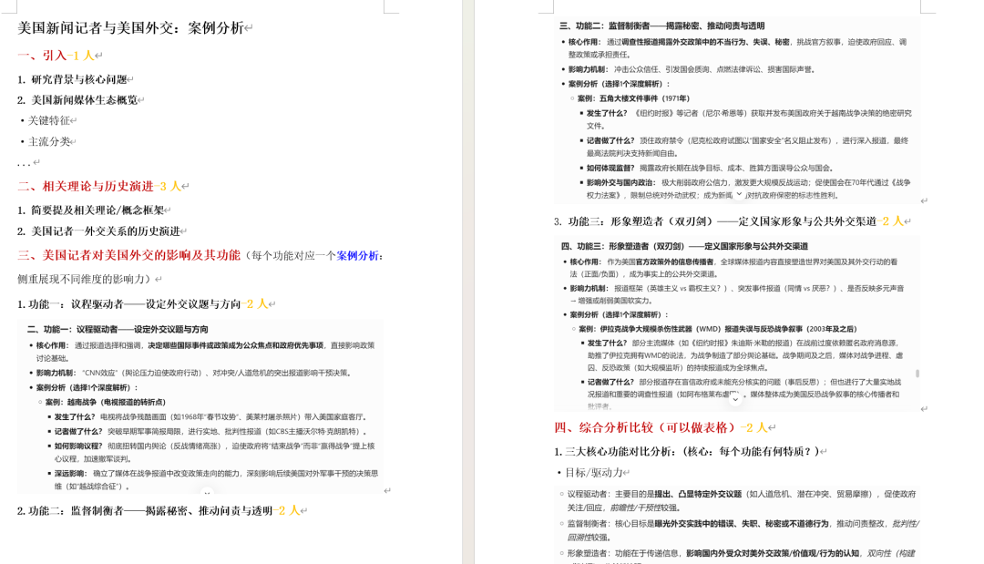 在小组作业中,我和同学们围绕 “美国新闻记者与外交政策” 展开专题研讨。我们的小组成员背景多元,在合作中,大家充分发挥各自所长:国际政治专业的同学负责搭建理论框架和分析视角、法学专业的同学关注规则与伦理层面、计算机专业的同学利用数据工具辅助信息搜集与可视化呈现,我则结合语言与传播知识,负责内容整合与项目部分展示。这种跨学科的思维碰撞,拓宽了我的认知维度,激发我对于课题的深度思考。