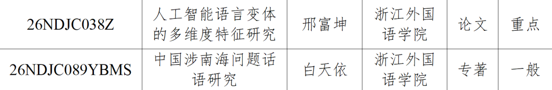 近日,经专家评审,省社科联党组研究,省哲学社会科学工作室审批同意,2026年度浙江省哲学社会科学规划课题立项名单公布。威廉体育经理邢富坤教授申报的“人工智能语言变体的多维度特征研究”与白天依博士申报的“中国涉南海问题话语研究”项目获批浙江省哲学社会科学规划课题立项。