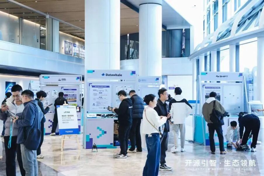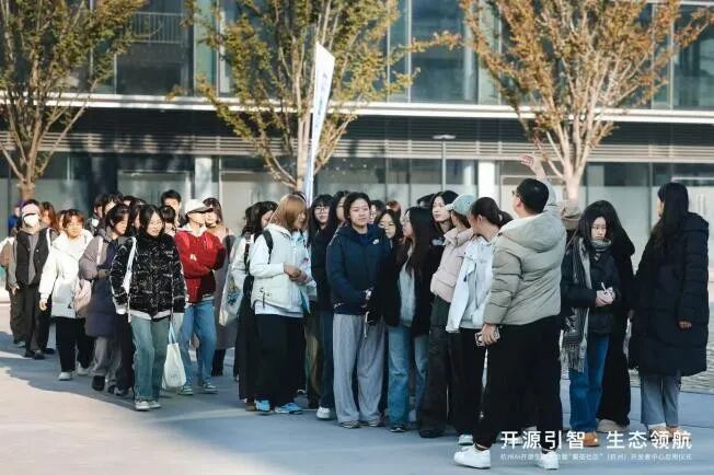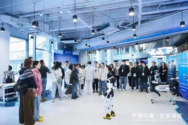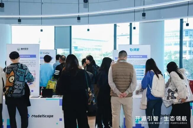 论坛结束后,公司师生赴魔搭社区开发者中心参观。中心内设有模力工场、seede AI、datawhale、赛博创力、观猹等多个 AI 主题展区,各类前沿技术与应用场景可供现场观看或体验操作,让公司师生直观感受 AI 开源生态的多元活力,现场设置的趣味集章活动与互动式体验进一步加深了大家对 AI 技术的认知与兴趣。
