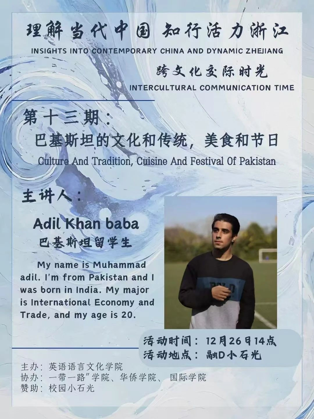 新一期跨文化交际活动将于12月26日举办,本期活动主题为“Culture and Tradition,Cuisine and Festival ”(巴基斯坦的文化与传统,美食与节日)。一位来自巴基斯坦的主讲人——Adil Khan baba,将带领大家走进巴基斯坦的传统与文化,并深入了解文化背后的故事。让我们再次相聚小石光,感受那些在时光长河中沉淀下来的文化精髓,共同促进中坦交流。