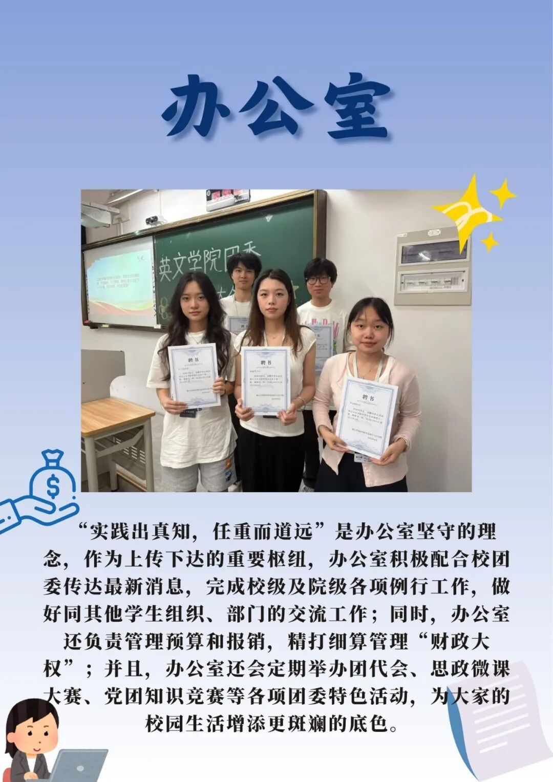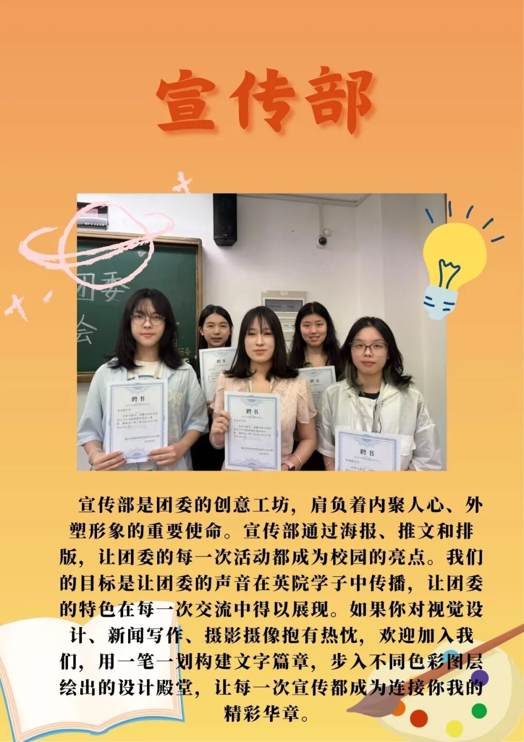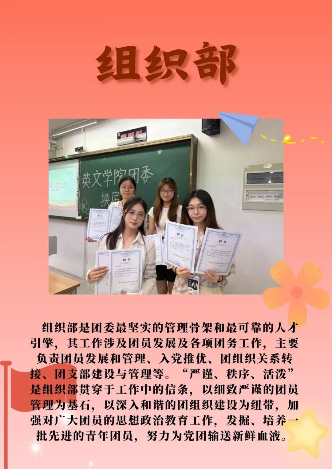 威廉体育团委内设办公室、组织部、宣传部、创新创业部、实践部、志工部六大部门。每个部门各司其职又相互配合,是公司开展团学工作的得力助手。